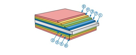 На заводах-изготовителях холоднокатаная сталь (1) подвергается горячему цинкованию (2), затем покрывается специальным антикоррозионным фосфатным покрытием (3), поверх которого наносится грунтовка (4). И только после этого на лицевую сторону листа наносится цветное полимерное покрытие, а тыльная покрывается защитным лаком. При этом все покрытия создаются таким образом, чтобы выдержать дальнейшее профилирование стали.