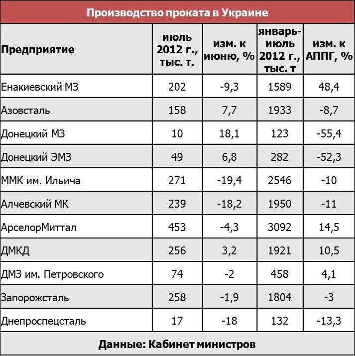 По данным Кабинета министров, в январе-июле украинские метпредприятия снизили производство готового проката на 2,9% по сравнению с АППГ до 16,21 млн. т. По итогам июля выпуск готового проката снизился на 6,6% в сравнении с июнем 2012 г. до 2,053 млн. т. Соответственно, данный показатель является самым низким с декабря 2008 г., когда производство проката составило 2,02 млн. т. Наибольшее снижение производственных показателей в ушедшем месяце продемонстрировали ММК им. Ильича (-19,4% в месячном исчислении), Алчевский МК (-18,2%) и Енакиевский МЗ (-9,3%). Представители метпредприятий объясняют падение уровней производства низким уровнем заказов со стороны зарубежных потребителей. Так, согласно заявлению руководства ММК им. Ильича вследствие затишья на мировых рынках, в настоящее время предприятие загружено лишь на 60% производственных мощностей. В свою очередь, представители топ-менеджента Алчевского МК на балансовом совещании предприятий ГМК сообщали, что на предприятии из-за неблагоприятной конъюнктуры рынков сбыта, остановлены одна доменная печь и машина непрерывного литья заготовки.