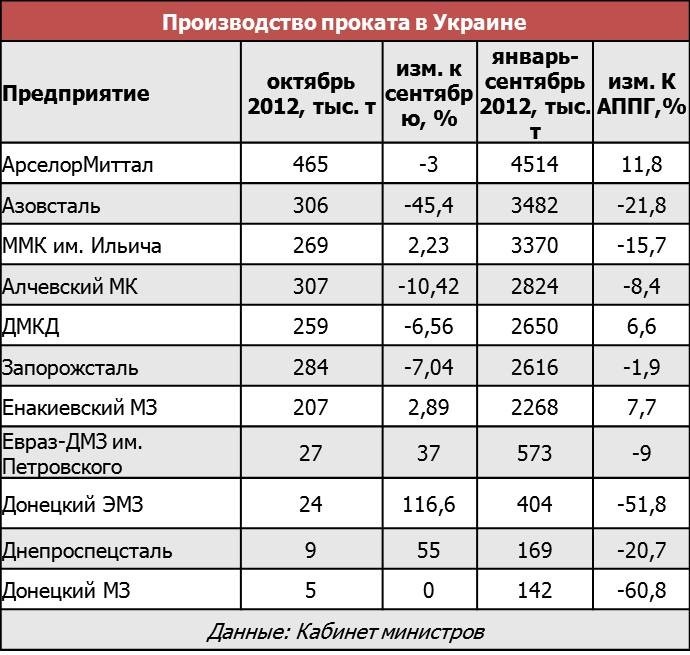 Как сообщило агентство "Интерфакс-Украина", ссылаясь на источник в правительстве, в январе-октябре отечественные металлургические предприятия сократили производство общего проката на 8% по сравнению с аналогичным периодом прошлого года до 24,256 млн. т. В месячном исчислении этот показатель снизился на 0,5% до 2,304 млн. т. Так, наибольшее падение по итогам ушедшего месяца продемонстрировали "Азовсталь" (-45,5% к сентябрю 2012 г.), Алчевский МК (-10,42%), и "Запорожсталь" (-7,04%). В свою очередь, наибольшее увеличение производственных показателей было отмечено на Донецком ЭМЗ (116,6%) и "Днепроспецстали" (55%).