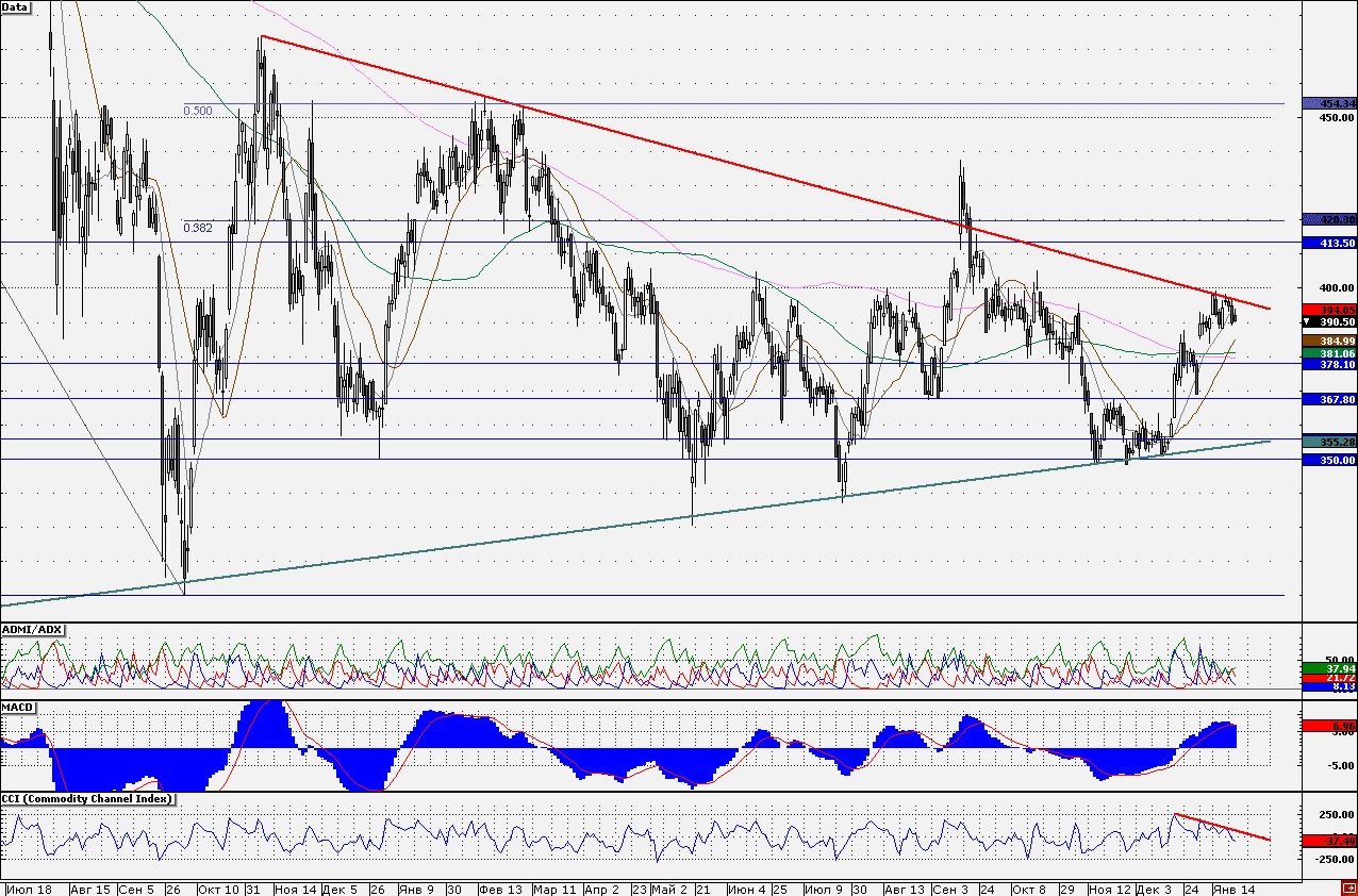 Таким образом, в ближайшее время акции могут закрыть гэп на уровне 378,10 руб., образованный от 8 января 2013 года, данная отметка усилена близостью 200-дневной скользящей средней, но вероятно и она будет пройдена вниз. Далее бумаги могут направиться к нижней границе "треугольника", которая сегодня располагается на уровне 355 руб. Я бы рекомендовала возможные отскоки использовать для закрытия длинных позиций. Откупать акции стоит лишь после сигналов на разворот от нижней границы сформированной фигуры.