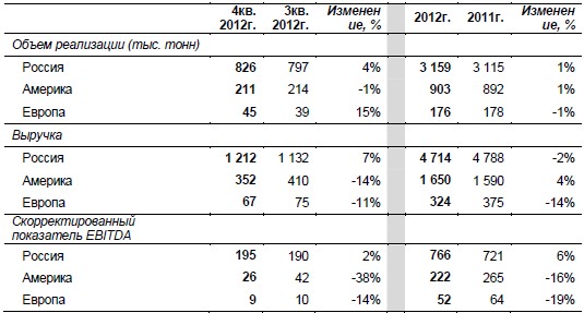 - Скорректированный показатель EBITDA снизился по сравнению с 3-м кварталом 2012 года на 5% и составил 230 миллионов долларов США, что связано со снижением объемов продаж и цен в американском дивизионе. Рентабельность по скорректированному показателю EBITDA в 4-м квартале 2012 года составила 14%.