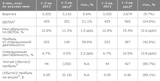"Северсталь" сообщает финансовые результаты своей работы за первый квартал 2013 года.