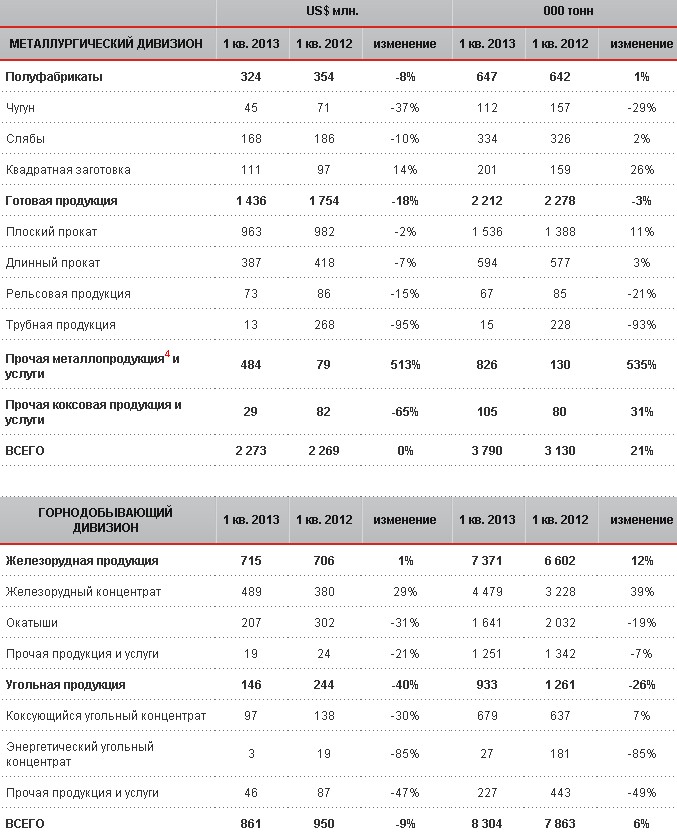 В 1 кв. 2013 года выручка от реализации полуфабрикатов снизилась на 8% до US$324 млн. по сравнению с аналогичным периодом 2012 года, в основном, в результате снижения объемов реализации чугуна на 45 тыс. тонн и падения цен на слябы и квадратную заготовку.