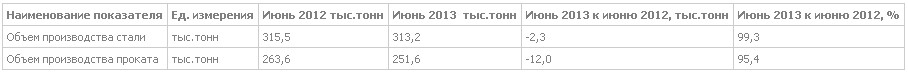 В июне 2013 г. произведено 313,2 тыс.т. стали, проката — 251,6 тыс.т.