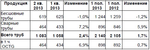 Отгрузка бесшовных труб снизилась на 1% относительно аналогичного периода 2012 года, составив 1 244 тысячи тонн в первом полугодии 2013 года. Отгрузка второго квартала также снизилась на 1% по сравнению с первым кварталом до 619 тысяч тонн.