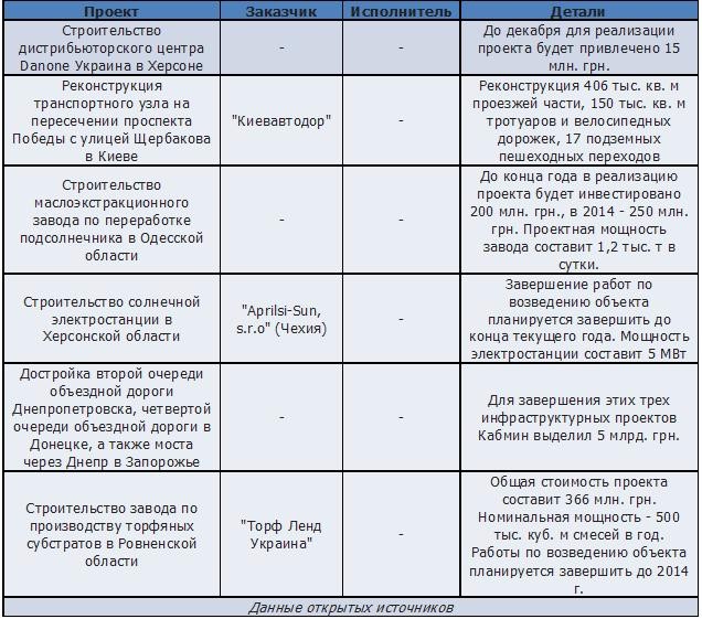 Среди регионов, РіРґРµ наблюдается наибольС?РёР№ уровень активности РІ строительстве, стоит выделить Киев. Р’ частности, здесь продолжаются работы РїРѕ реализации проекта строительства станции метро "Теремки". Финансирование РІ настоящее время осуществляется стабильно Рё его объем СѓР¶Рµ превысил 200 млн. РіСЂРЅ. Другим важным инфраструктурным проектом РІ столице является развязка РЅР° Почтовой площади, заверС?ить работы над которой, РїСЂРё условии своевременного поступления средств, планируют РІ октябре. Также продолжаются работы РїРѕ реконструкции киевского "ЦУМа", РіРґРµ РІ настоящее время проводится строительство двухуровневой подземной парковки Рё РјРёРЅСѓСЃ первого этажа. Также РІ РіРѕСЂРѕРґРµ Богуслав Киевской области начали строительство РЅРѕРІРѕРіРѕ ледового дворца, заверС?ить работы РїРѕ которому планируют РґРѕ конца текущего РіРѕРґР°.